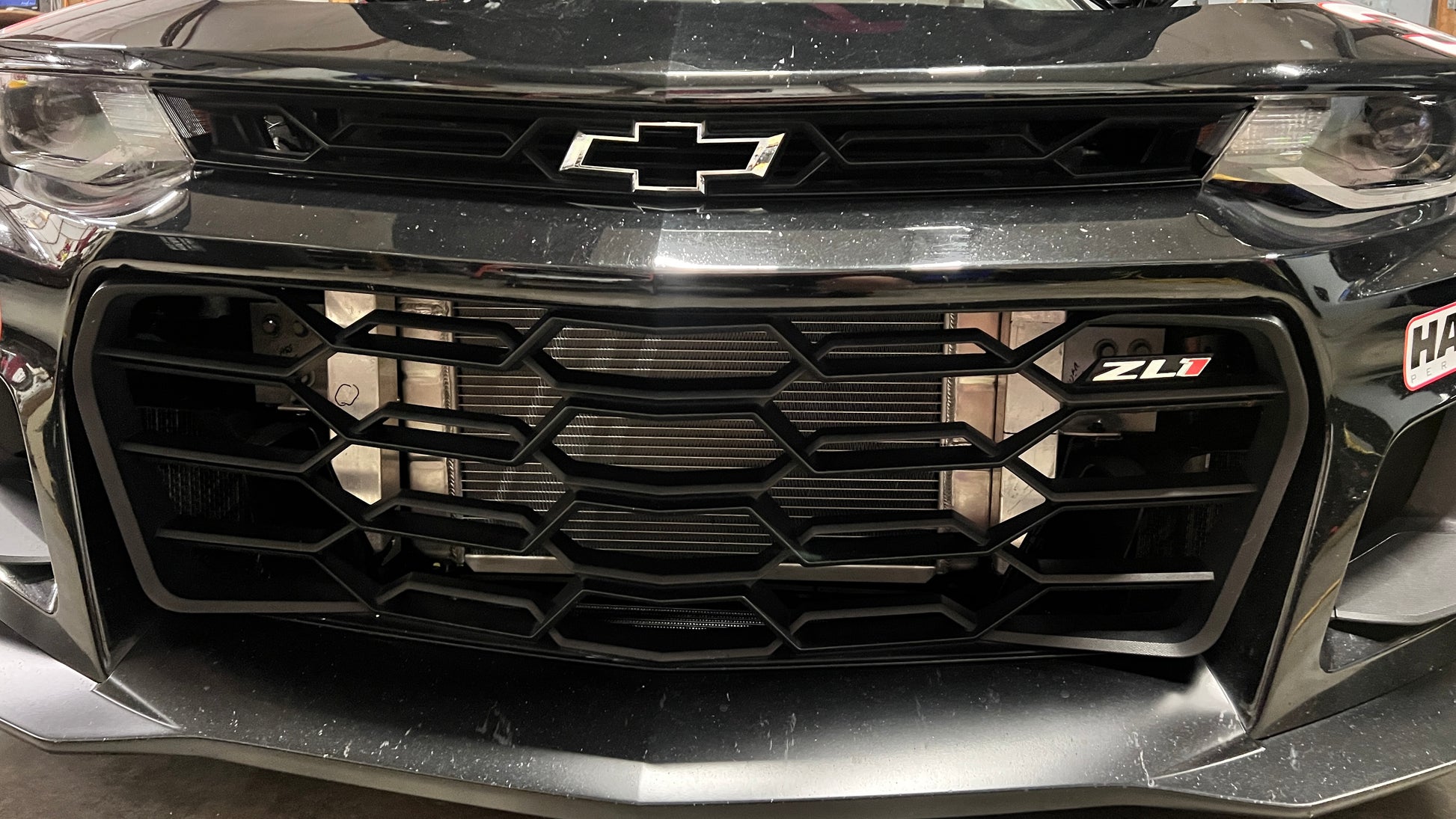We started with the heavy GMS Impact bar that had to be cut & modified to work with the proper Porsche RSR Oil Cooler. Removing the airflow restrictive aluminum OEM Impact Bar and adding a steel bar that had a maximum opening of 22", restricted the full width of the ZL1 grill opening. So I designed a wider and more developed support system for the oil cooler with a focus of actual track use. Our latest design is made from structural aluminum and reinforced to have zero flex but at the same time, HALF THE WEIGHT of the GMS Impact bar and also offers the option of ELIMINATING the transmission Aux Cooler!! This is a huge gain in controlling the aerodynamics and adding more frontal downforce by eliminating the huge hole of hot airflow under the front end of the car! Initial testing at Carolina Motorsports Park, VIR, Road America, Lime Rock Park and Charlotte Motor Speedway have proven this new design will increase downforce without the drag associated with a larger front end splitter.